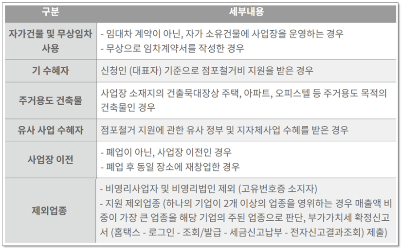 : 전용면적(3.3 m2) 당 13만원 이내로 지원 되는데, 점포 철거 및 원상복구 비용의 250만원 한도 내에서 지원(부가세 제외) 됩니다.  단, 아래 제외사항에 1개라도 해당되는 경우는 지원 대상에서 제외됩니다.
